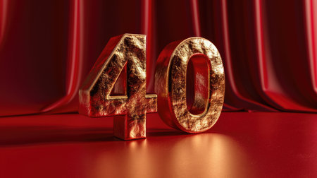 A close-up view of a shiny golden forty with the number 40 repeated forty times on its surface. The object reflects light, showcasing its golden hue and intricate design