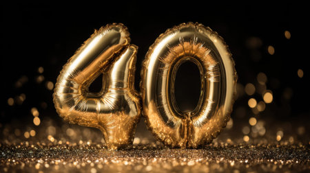 Golden 40th birthday celebration with sparkling gold balloons and glittering background.