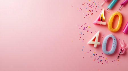Number candles forming 40 with confetti spread across pink background, clean space for party message