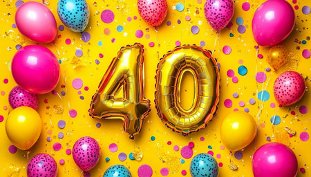 Golden Number 40 Balloons with Colorful Confetti for 40th Birthday Celebration on Yellow Background