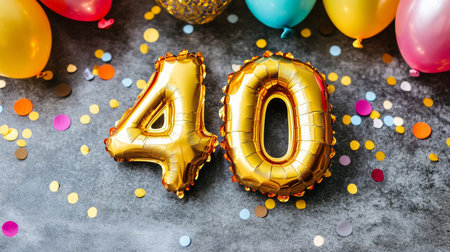 Golden Number 40 Balloons with Colorful Confetti and Balloons on a Festive Background