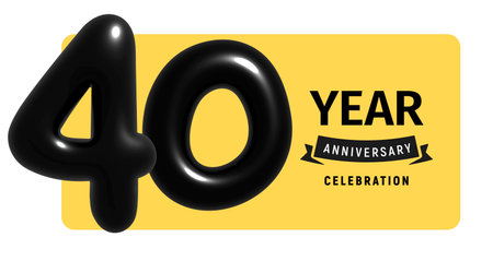 40 year anniversary celebration with bold glossy black 3D numbers on yellow background, joyful and modern. Event branding, printable milestone design. Vector illustration.