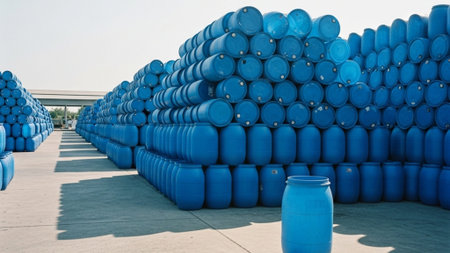 Blue oil barrels arranged in a warehouse setting, with a clean background and space for text, emphasizing industrial storage