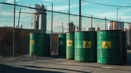 Metal barrels with hazardous material labels stacked near a factory, emphasizing safety concerns.