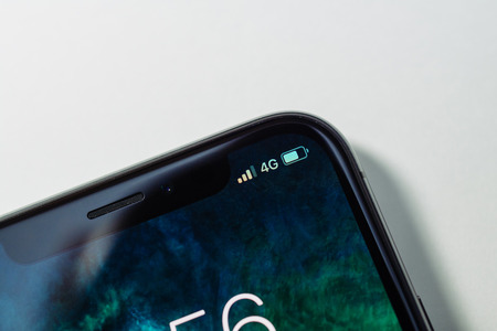 PARIS, FRANCE - NOV 3, 2017: 4G LTE icon in the corner of the new OLED Apple iPhone X 10 from Apple Computers