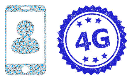 4G scratched stamp seal and vector fractal mosaic smartphone portrait. Blue stamp seal has 4G caption inside rosette. Vector mosaic is created of random rotated smartphone portrait icons.