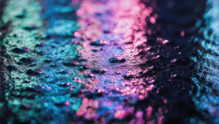 Close-up view showcasing rain-slicked surface with vibrant, multicolored reflections
