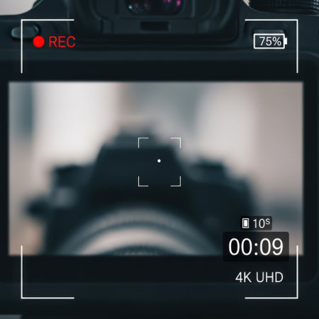 This image features a close-up view of a camera screen displaying various recording information. The screen shows a blurred scene, a red REC indicator, battery level, time, and resolution. The image is set against a transparent background, making it suitable for various digital applications.