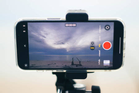 A person captures a beautiful city sunset on their phone, showcasing the golden hour light and urban landscape.