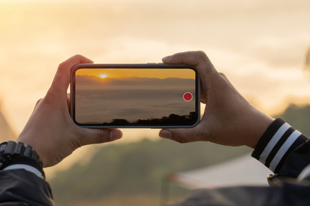 Hands taking photo, recording video on smart phone over real morning mist on high mountains