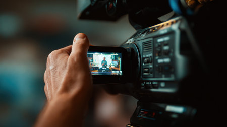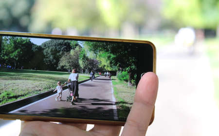 One person holding camera, photographing outdoors, focus on foreground generated by artificial intelligence
