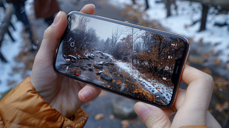 Person taking a photo of a snowy trail with their smartphone during winter.