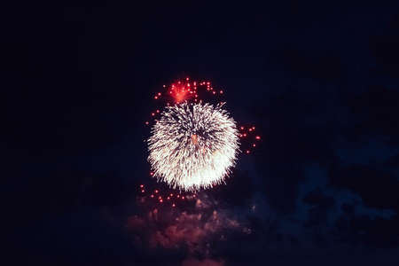 Beautiful colorful holiday fireworks on the black sky background, long exposure