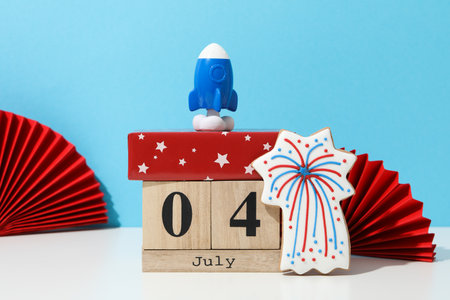 Cute wooden calendar with fourth of July date on blue sky background. Background for US Independence Day