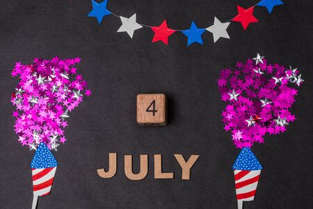 4 July, phrase made from wooden letters and numbers, fireworks and colorful stars on black background