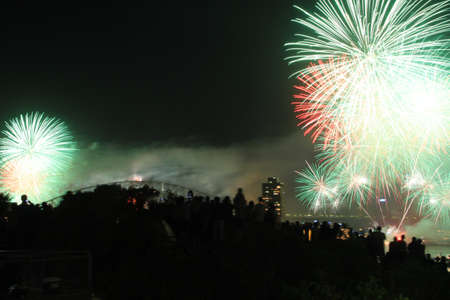 A vibrant fireworks show lights up the night sky over a bustling city skyline, creating an atmosphere of joy and celebration among the gathered crowd.