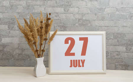 July 27. 27th day of month, calendar date. White vase with ikebana and photo frame with numbers on desktop, opposite brick wall. Concept of day of year, time planner, summer month.