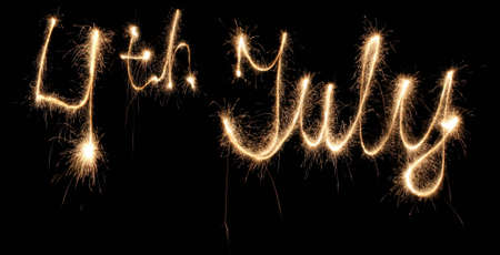 4th of July text created with sparklers on a dark night with smoke and light. Independence Day celebration for a holiday greeting card.