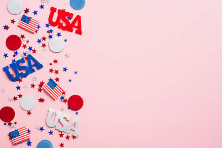 Independence day USA banner template with American flags, sign USA and confetti. 4th of July celebration poster template. Patriotism and US national holidays concept