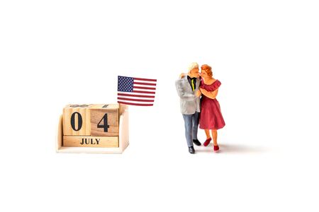 selective focus of miniature people , couple , and family with United State flag isolated on white background, creative image for 4 July independent day celebrate concept.