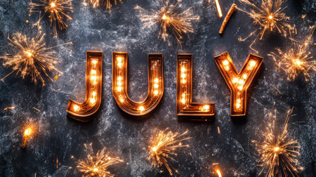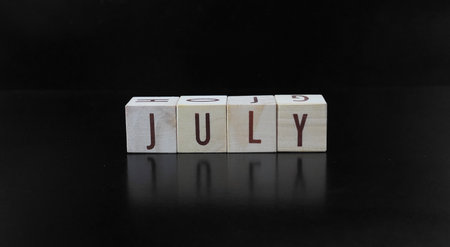 The word JULY is made of letters formed from wooden blocks, isolated on a black background.