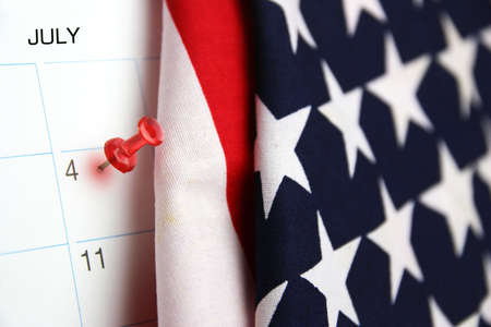 The American Flag draped on a Flag Stand next to a calendar showing JULY 4 american independence day