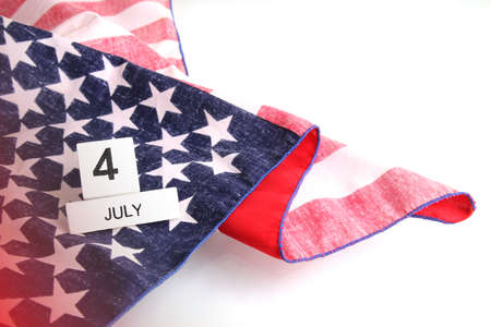 4th of July text and United States of America flag folded on red background. USA Happy Independence Day concept.
