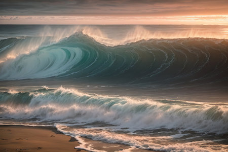 Bright waves crest against a calm sea at sunset, creating a stunning visual of nature's beauty and energy.