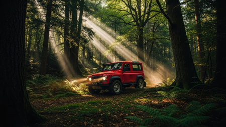 A vibrant red SUV is parked in a verdant forest, bathed in dramatic beams of sunlight filtering through the trees. The image showcases the vehicle's design and color against a backdrop of rich greens and browns. It may be suitable for automotive advertising, environmental themes, or lifestyle concepts.