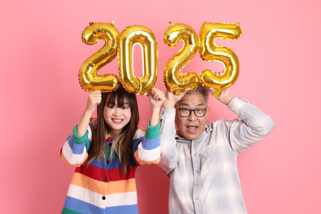 Asian senior man and young woman in casual look hand holding 3d golden metallic balloons forming the number 2025 with two thousand twenty-five New Year isolated on pink background.
