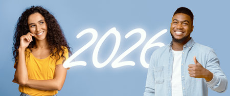 2029 new year celebration moment. African American man with dark skin raising hand and holding colorful number collage, joyful office team, christmas and business party concept background.