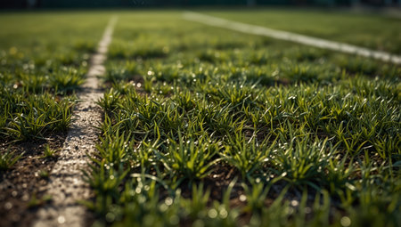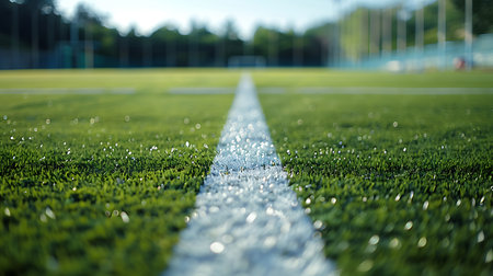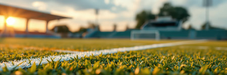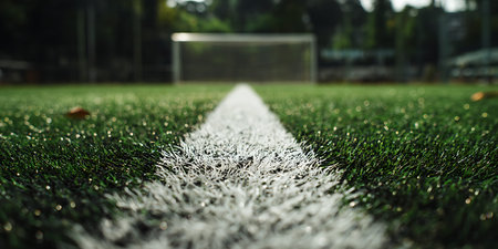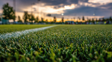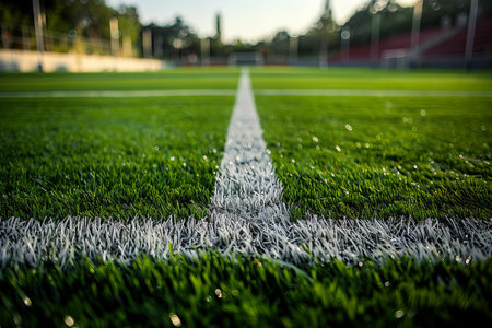 Captivating close-up of a sports field featuring lush green artificial turf with a striking white line, illuminated by soft evening light, ideal for athletic themes.