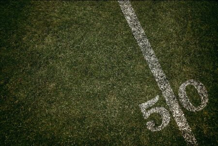 Football field ground fifty yard line. Friday night lights.