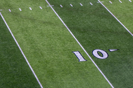 Football field green grass white yard markers to touchdown competition game