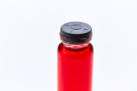 Covid-19 vaccine - coronavirus vaccination bottles. Ten injection vials with red cap on white background. Selective focus on the first vial. Immunization treatment. Bottles of ten milliliters.