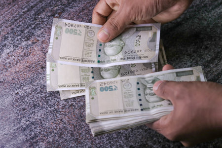 Hands counting new 500 Indian Rupee banknotes. Finance, wealth, and savings concept.
