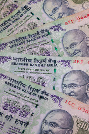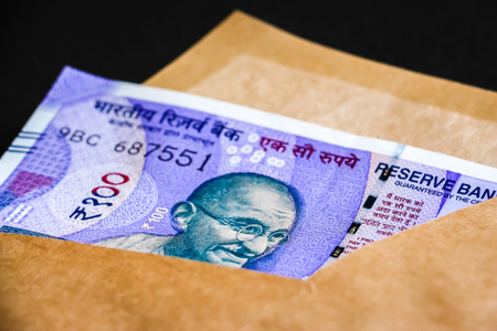 Close up view of envelope with brand new indian one hundred rupees banknotes.