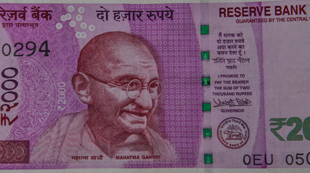 Portrait of Mahatma Gandhi on the new Indian currency note of 2000 Rupees denomination.