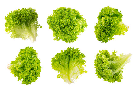 Set of lettuce organic salad leaves, fresh green hydroponic vegetable isolated on white background. Salad leaves from different angles and positions, close up. Vegetarian food, healthy lifestyle