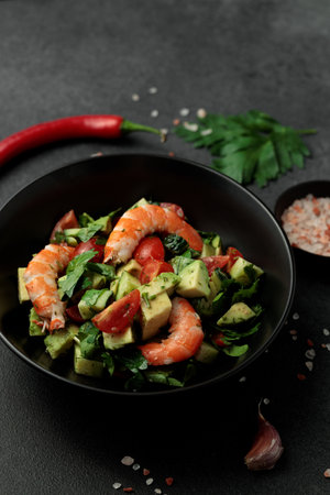 Salad of king prawns, avocado, cucumber, tomato and herbs. Black background