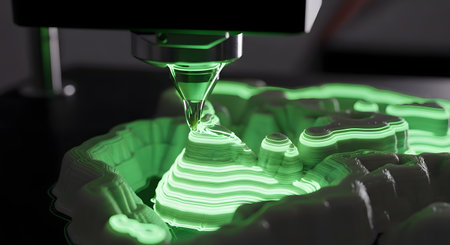 A close-up view of a 3D printer nozzle meticulously building a complex object layer by layer with a glowing green photopolymer resin. This image captures the essence of additive manufacturing, rapid prototyping, and modern technological innovation.