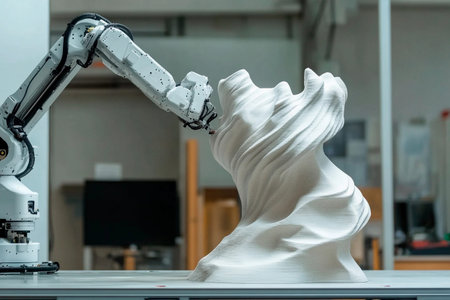 A robotic arm skillfully carves a detailed digital sculpture, resembling a shell, in a spacious art studio filled with creative tools and materials