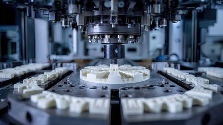 Close-up view of advanced machinery showcasing a precise manufacturing process. The image highlights the intricate details of components being shaped in a modern production environment.