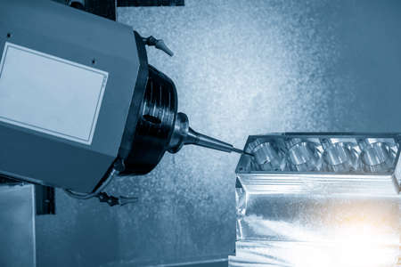 The 5-axis machining center cutting the aluminum V8 engine block parts with solid ball endmill tool. The hi-precision automotive manufacturing process by multi-axis CNC milling machine.