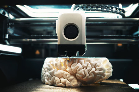 3D printing of a human brain model – front view of FDM printer under overhead light, showing additive manufacturing for neuroscience research and rapid medical prototyping.