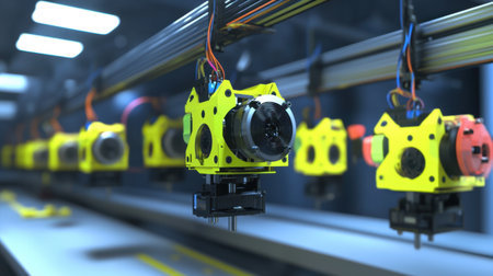 A close-up view of robotic components in a modern manufacturing setup, highlighting vibrant colors and intricate details essential for advanced production processes.