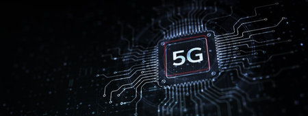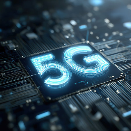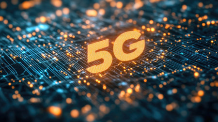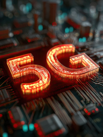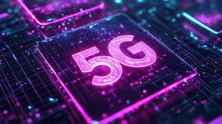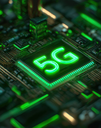 Close-up of a futuristic circuit board featuring a vibrant 5G symbol illuminated in neon colors, representing advancements in technology and communication.
