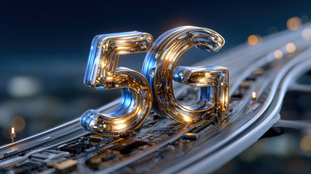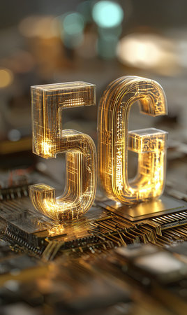 5G golden circuit number glowing on motherboard with bokeh light and futuristic digital data ambiance, high tech connectivity and wireless network energy