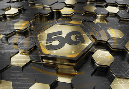 5G icon concept engraved on gold and black metal hexagonal pedestral background. Wireless technology logo glowing on abstract digital surface. 3d rendering