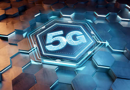 5G icon concept engraved on blue and orange metal hexagonal pedestral background. Wireless technology logo glowing on abstract digital surface. 3d rendering